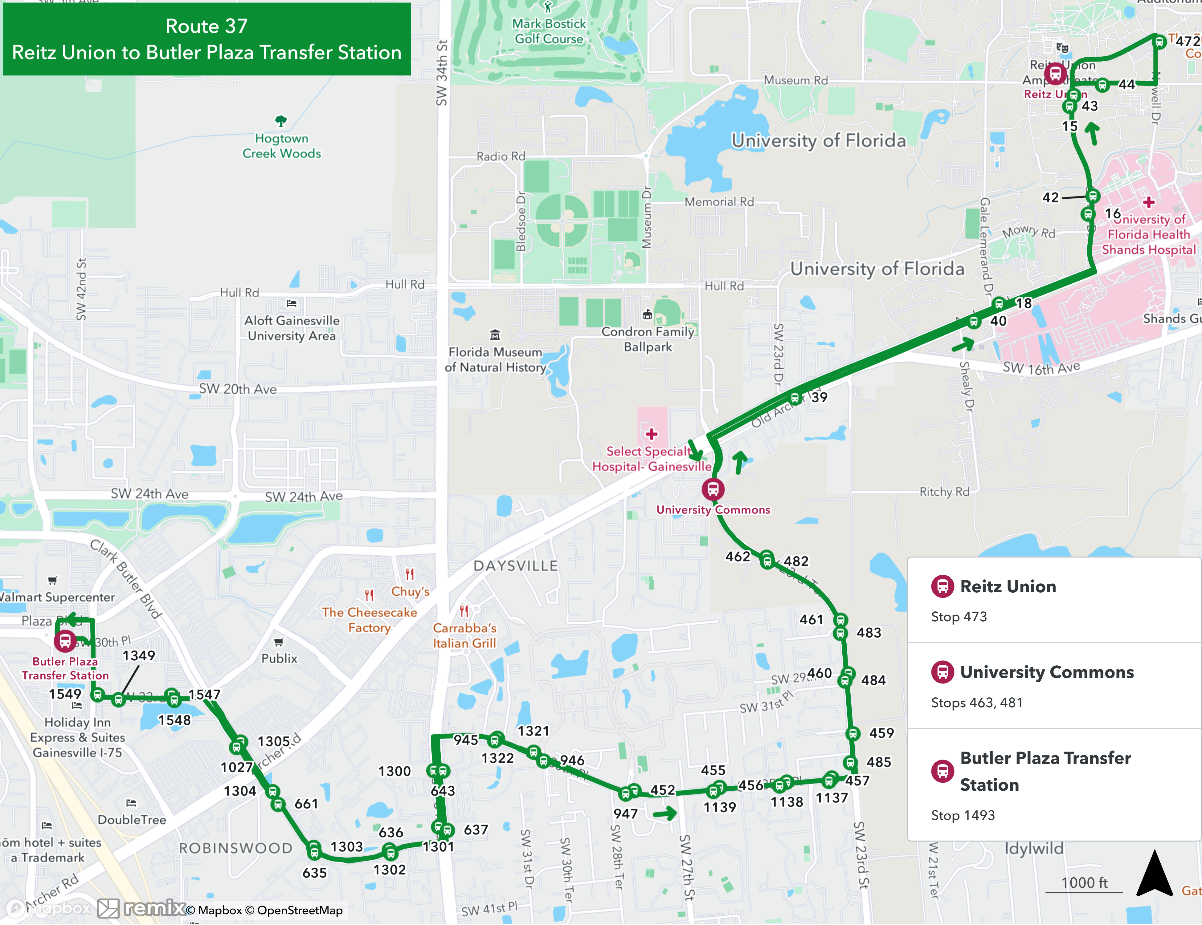 First run Reitz Union 9:55am / Last run BPTS 5:30pm